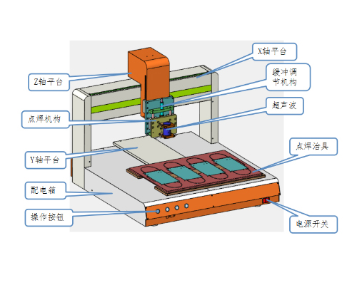 3.超聲波移動(dòng)至點(diǎn)焊位置進(jìn)行點(diǎn)焊,點(diǎn)焊完成,人手取料,完成一個(gè)循環(huán)。